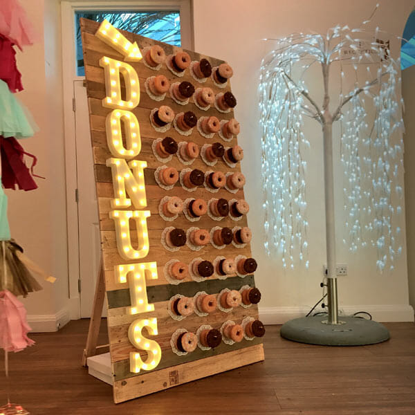 The perfect party piece for any party/wedding. OurĀ  Donut Wall has 12v light up lettersĀ  that put off a nice warm glow. Standing at just under 1.8 metres high and holding 80 donuts (100 provided with hire)